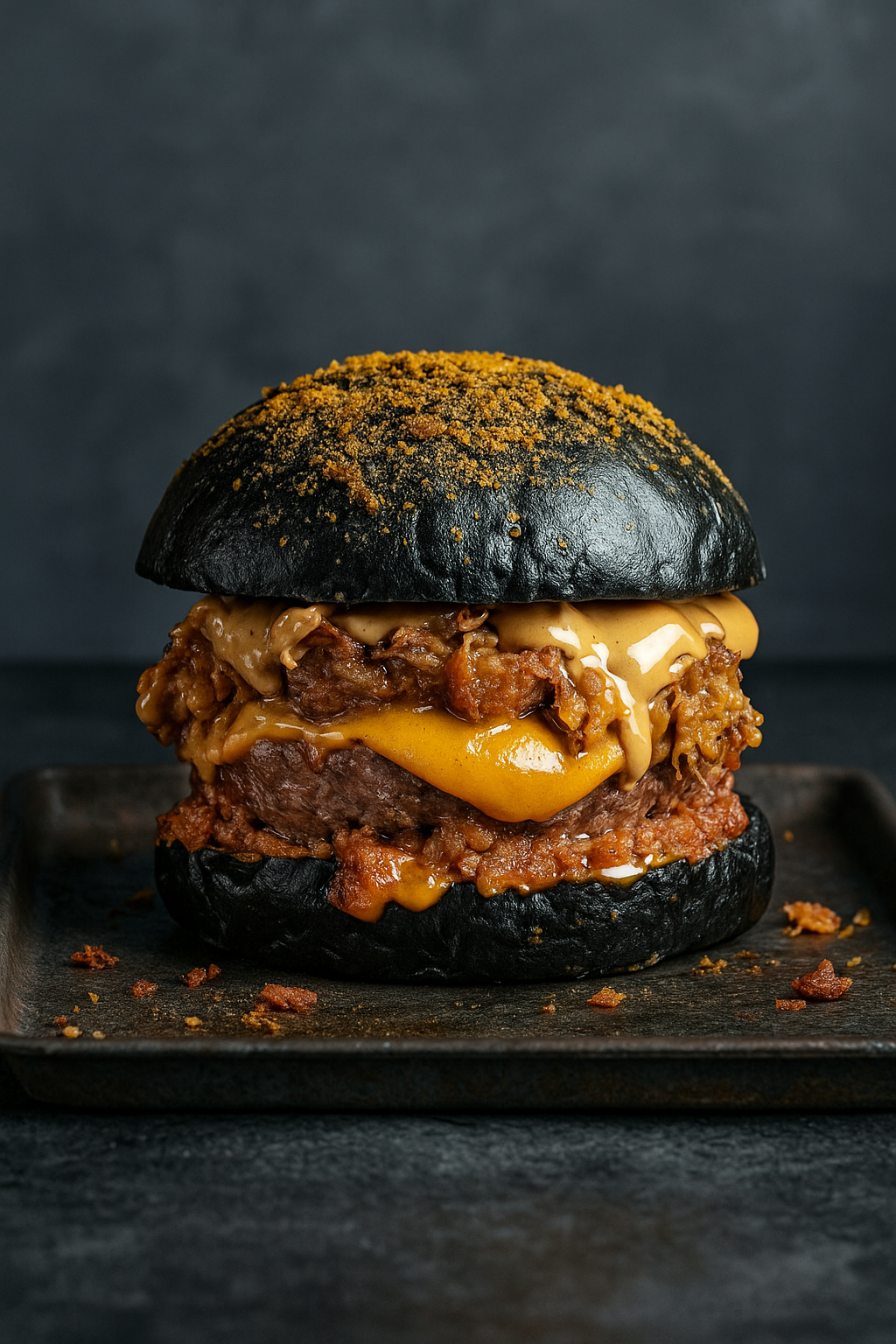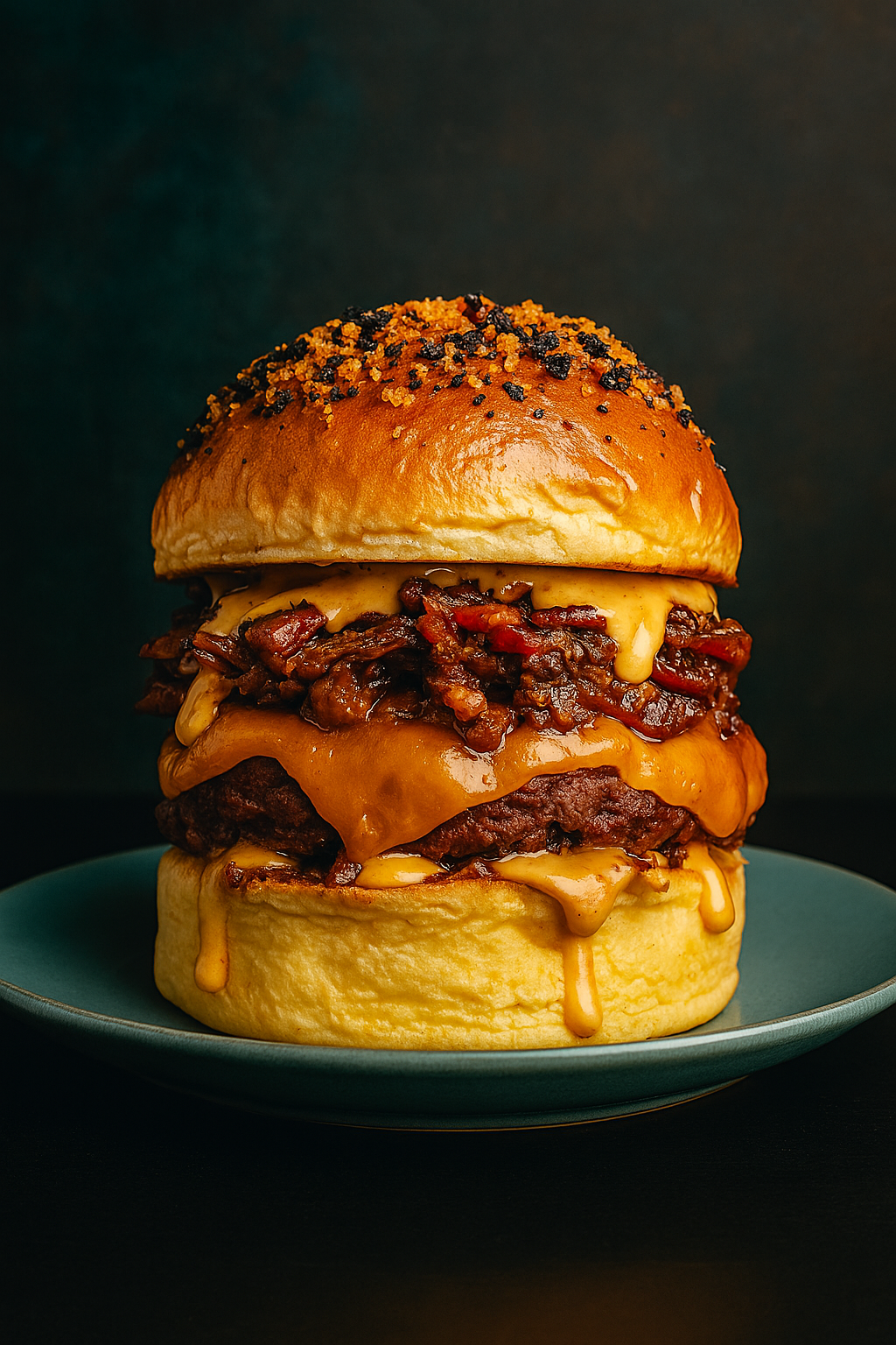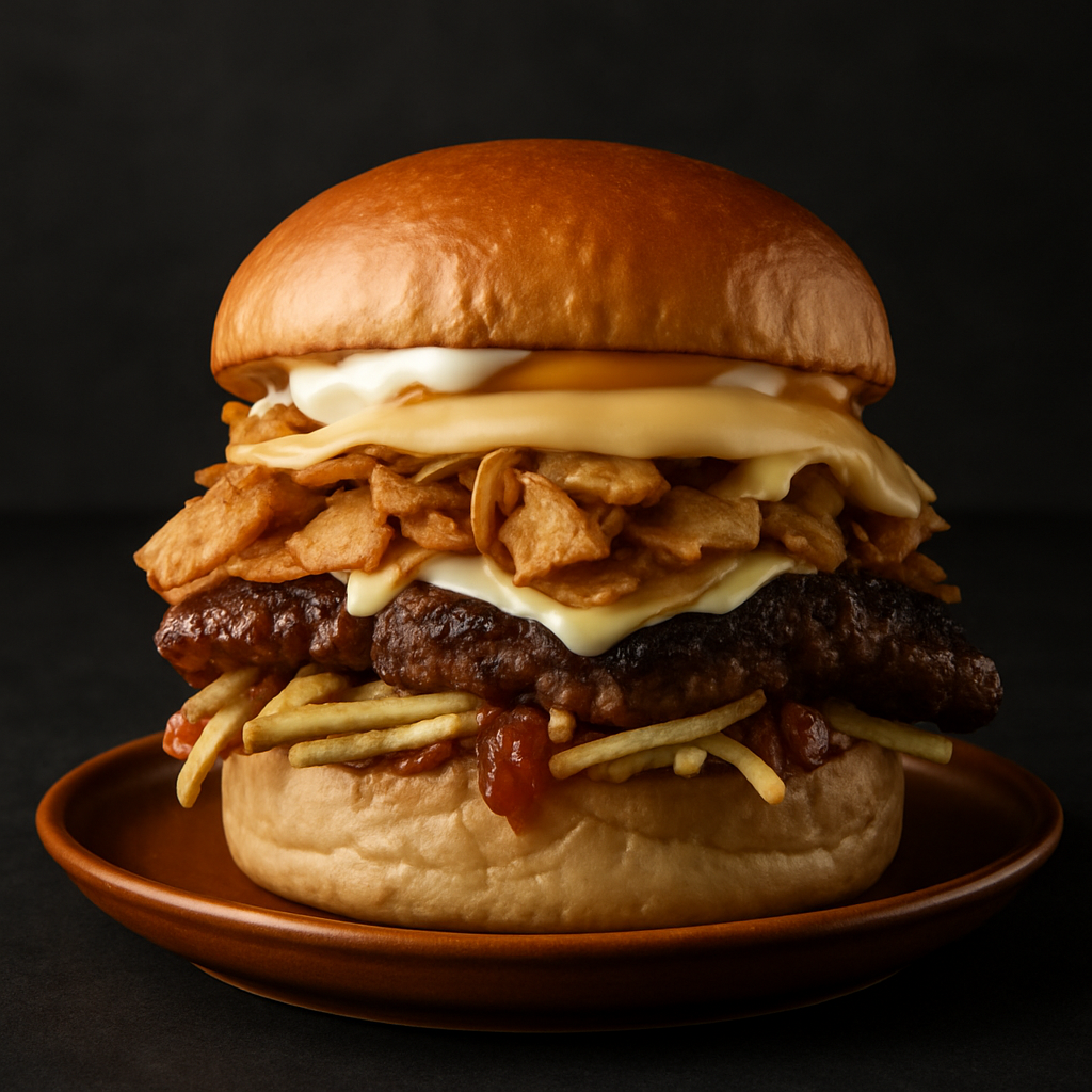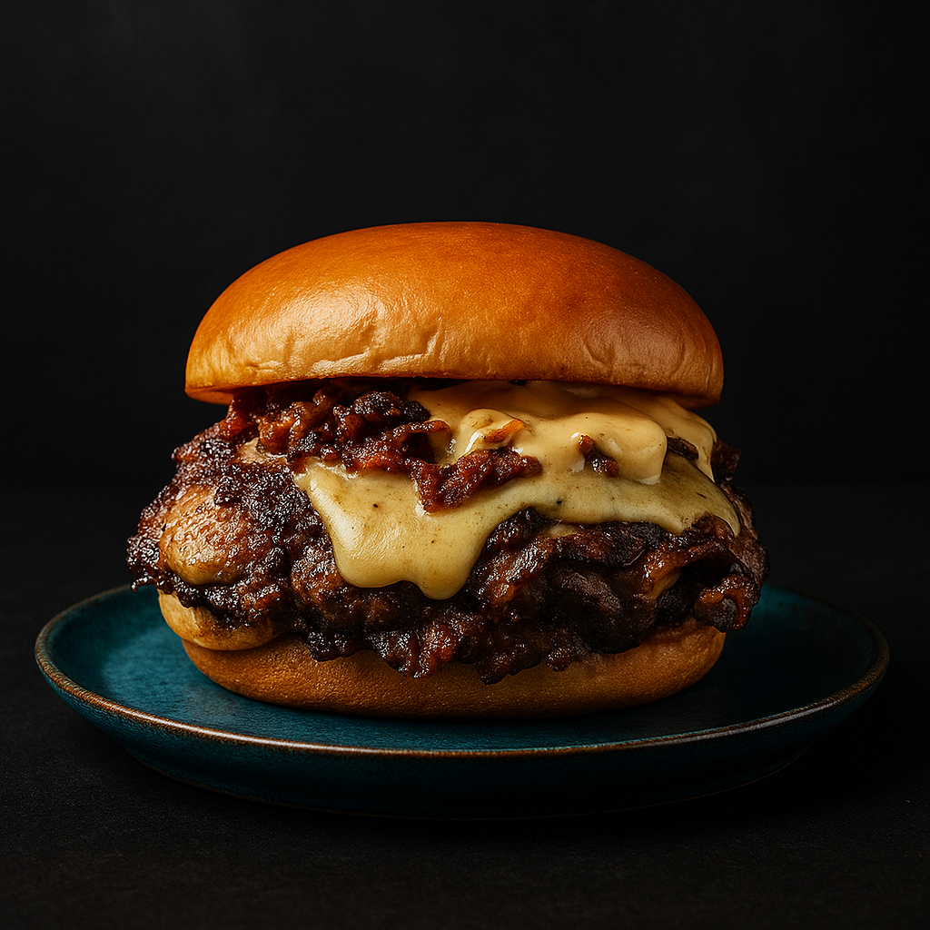 Nuestra clara favorita. La Royale Gold es una obra de arte digna de un campeonato con mayúsculas: carne de chuletón entre dos brioches coronados con pan de oro comestible, pastrami, costilla de angus deshilachada y una mermelada de cecina que roza lo divino. Todo rematado con crujientes bacon bits que aportan textura y un punto salino perfecto. No solo es visualmente espectacular —parece salida de un cuadro barroco— sino que sabe a lujo, a horas de cocción lenta y a respeto por el producto. Si el Champions Burger busca la excelencia, esta burger de Godeo ya la ha logrado.